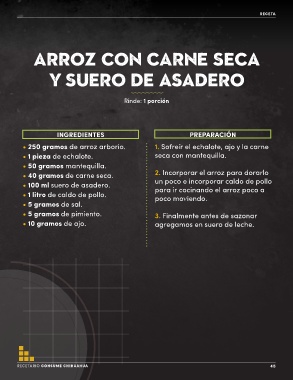 • 40 gramos de carne seca. 2. Incorporar el arroz para dorarlo