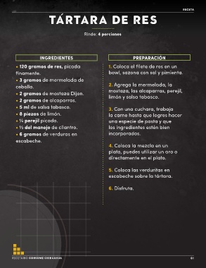 • 120 gramos de res, picada 1. Coloca el filete de res en un